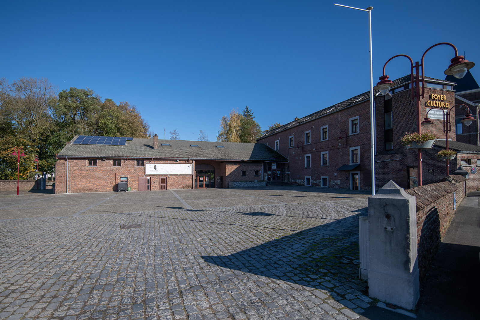 L'avant du bâtiment possède une cour pavée servant de parking lors des évènements intérieurs